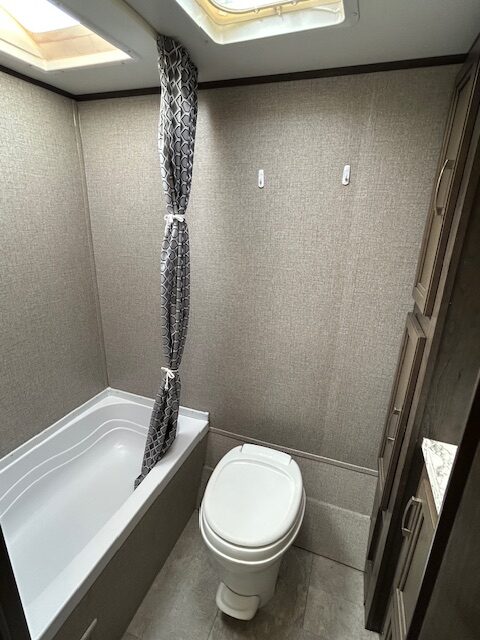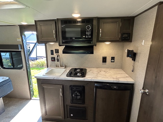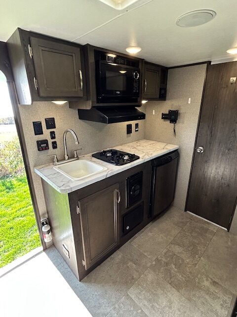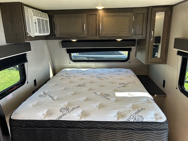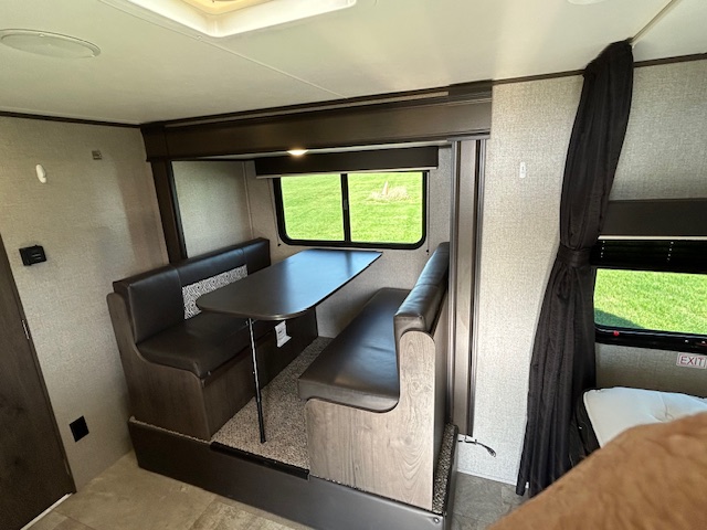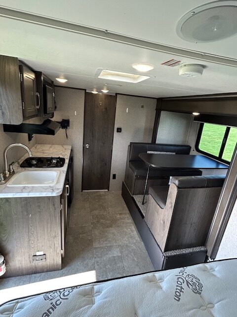 Electric awning with LED lights under it. New queen walk around bed with storage above, to the side and underneath. Wall slide out dinette table that folds into a bed. 2 burner stove /range hood, microwave, fridge. air-condition , automatic furnace, full bathroom with small tub/shower with a skylight , toilet and full vanity.